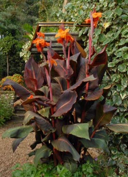 Large leaves emerge in spring and change to green with yellow stripes. Large bold orange flowers that attract bees, butterflies and hummingbirds. Flowers July to October.