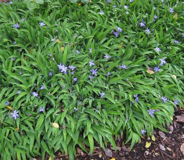 Small, frilly, violet-blue and yello flowers. Bright green, sword shaped leaves. Low growing, creating a carpet or ground cover.