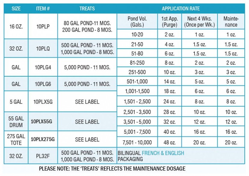 - 32 oz – Treats 500 gal. pond for 11 months or 1,000 gal. pond for 8 months.
