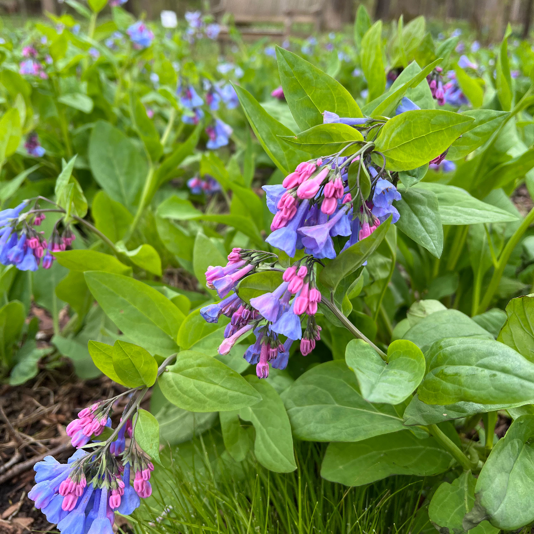 Virginia Blue Bells produce clusters of pink and purple buds which mature into blue bell shaped flowers over grey-green foliage. Spring ephemeral, perfect for woodland or shady gardens.